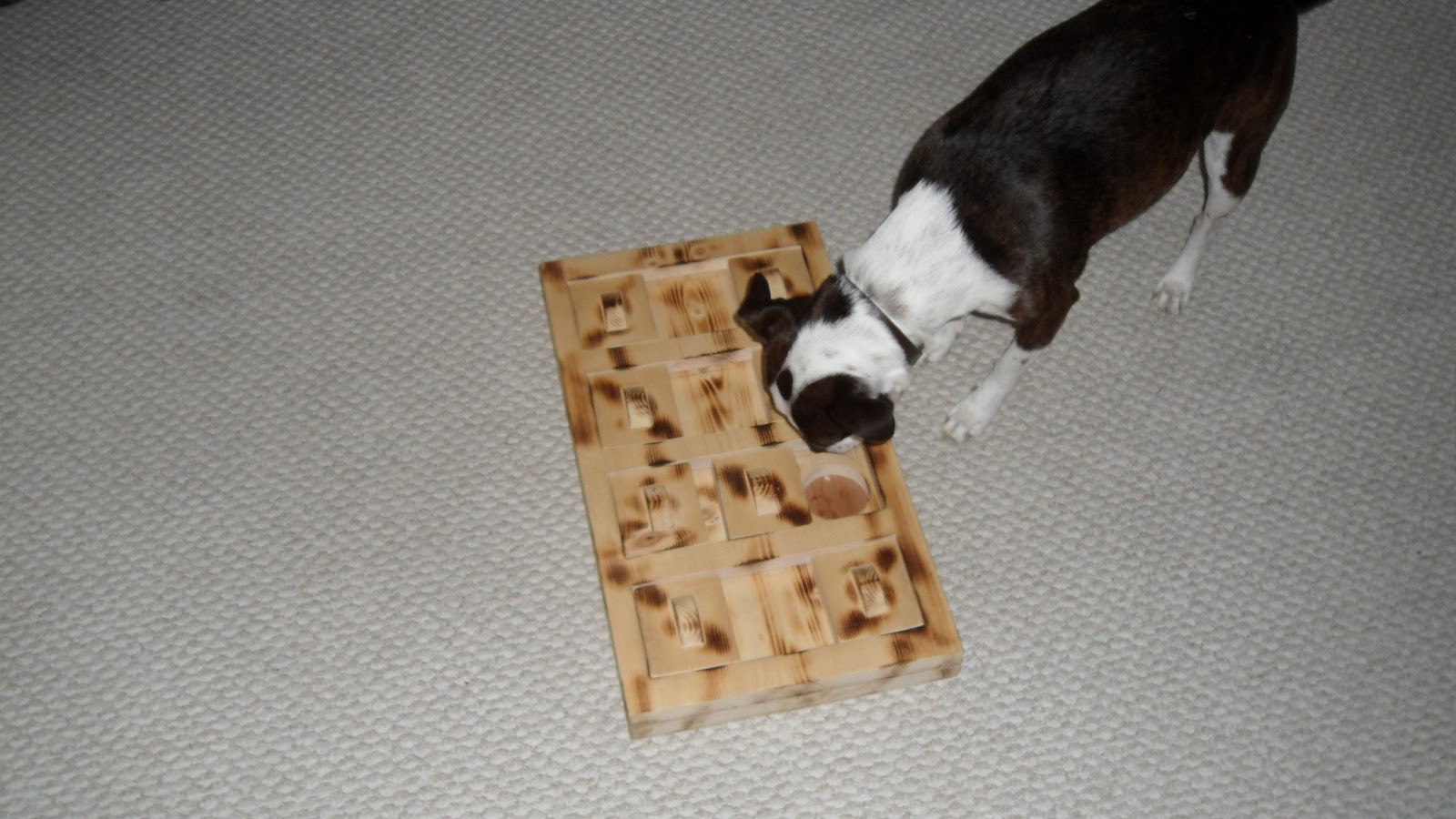 To challenge him more I had my Dad build him a "dog brick" and within a few days he had that down to a science. A "dog brick" is a puzzle type box where you put treats inside and the dog solves the puzzle to get the treats.